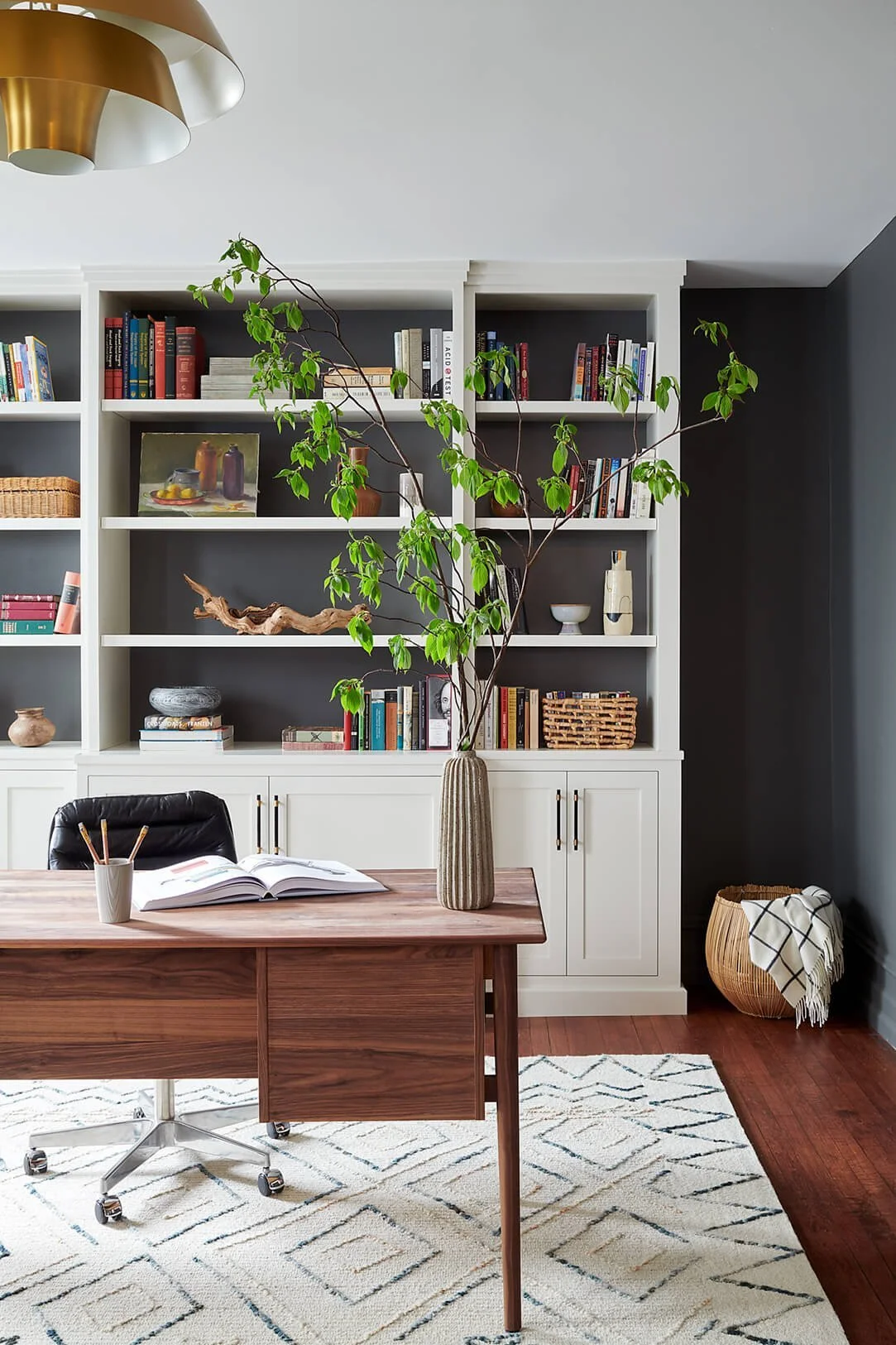The walnut desk warms up the darker tone on the walls and provides multiple file folder and regular storage drawers while still managing not to feel bulky with slim legs and mid-century style details. The whole space is grounded by a light colored rug to brighten up the space and features blues and rusty oranges while a fun brass ceiling-mounted fixture draws the eye up.